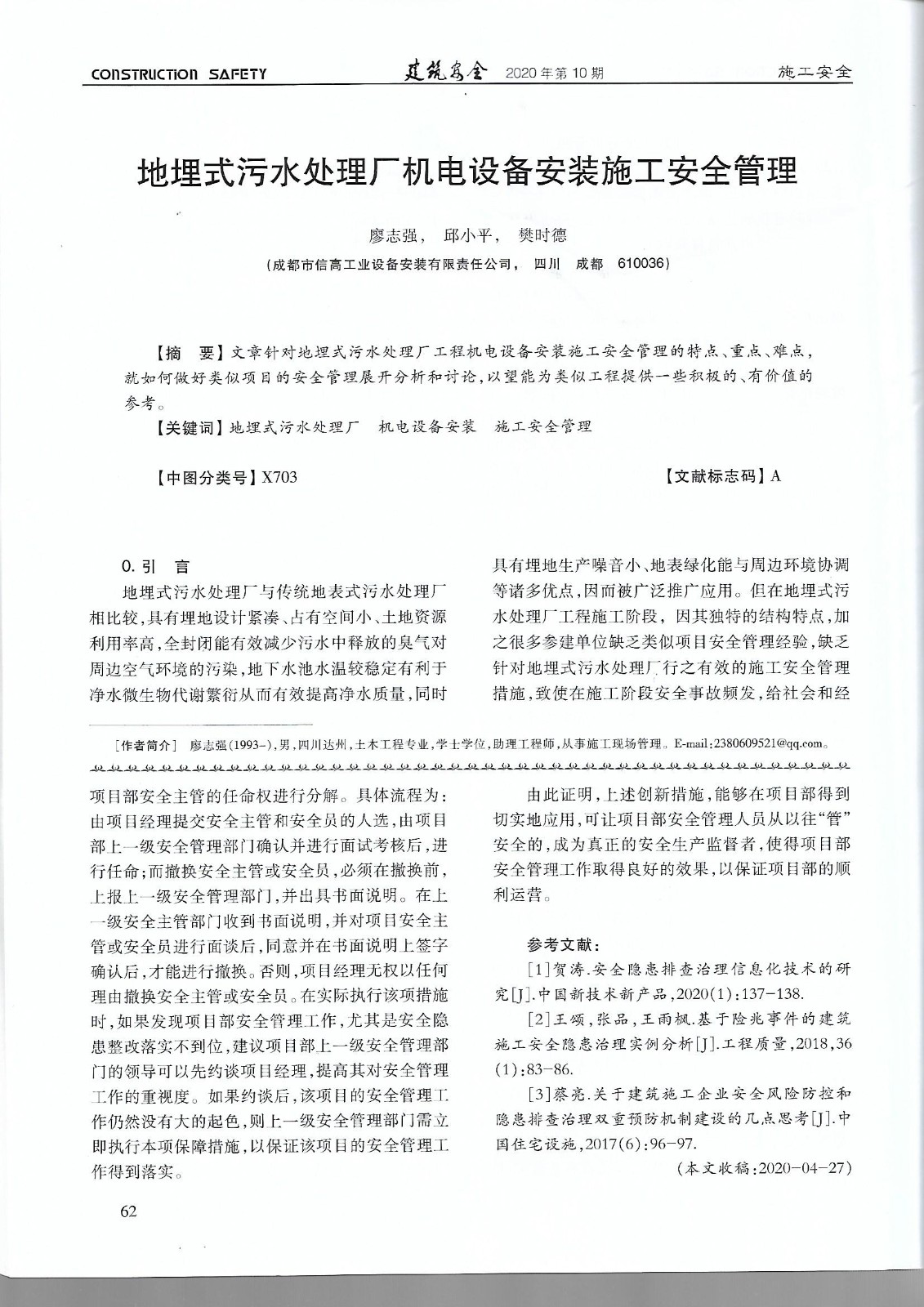 由我司廖志強,邱小平,樊時德編寫的<地埋式污水處理廠機電設備安裝施工安全管理>已于《建筑安全》雜志10月號全文刊登!